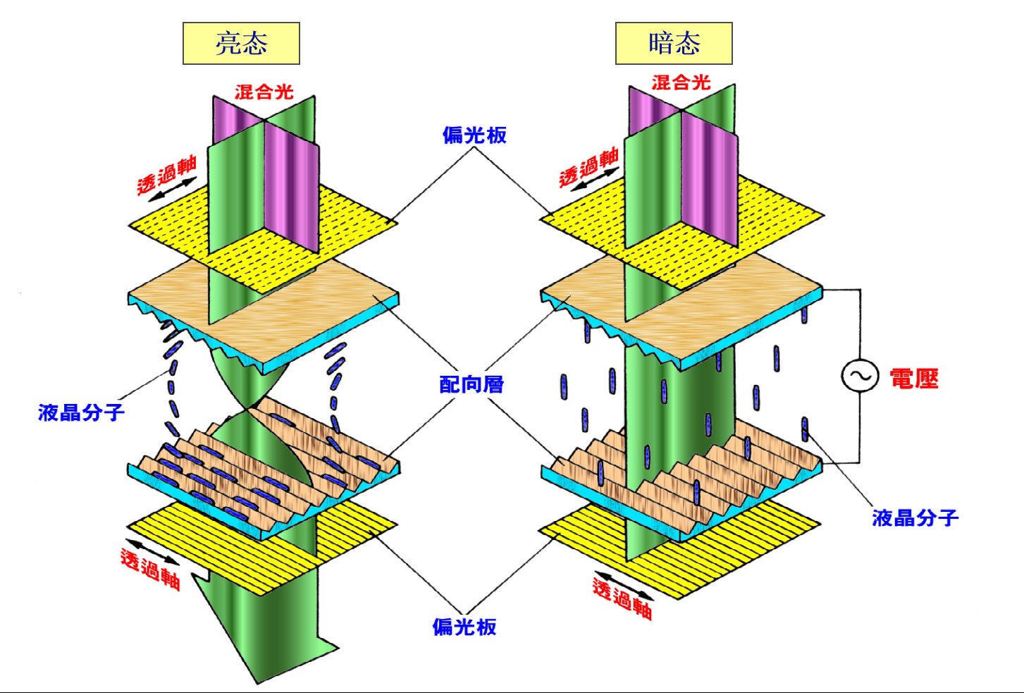 In statu obscuro (statt ostensio), liquor moleculae crystallinae in locis in quibus campus electricus applicatur, alignment mutationem suam et facultatem levem rotandi amittunt. Lumen polarizatum e polarizer ante emissum mutare directionem non potest et obstruitur, quia directio polarizatio eius perpendicularis est ad partem polarizer posterioris, causans areas istas nigras apparere.