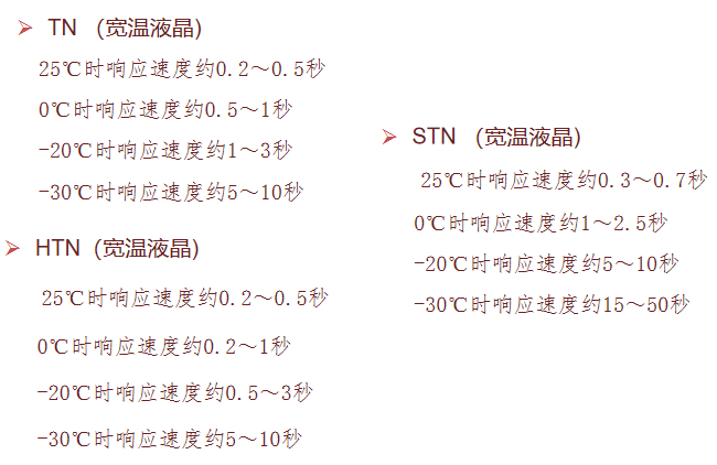 Lata temperatura provocatio: In applicatione missionum latae temperaturae, responsionis mora temperaturas infimis neglecta esse non potest. Exempli gratia, modulus amplus temperatus TN LCD responsionis tempus habere potuit usque ad 10 seconds ad -30°C, gravem imaginem fovens. Hoc requirit artifices LCD propono ut liquidas cristallinas materias diligenter selectas et parametros scopo operandi ad modum activitatis accommodes, ut responsio utilis perficiendi etiam sub extrema condicione utatur.